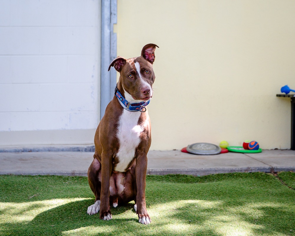 Meet Sophia! There is nothing she would love more than to be a lap dog. Sophia thrives on attention and cuddles, and she would love to share her big heart with you! Sofia has lots of happy energy, and would love to be an exercise or running companion. She is a one year old, 51 pound pit mix. Thanks to the Pit Project and her sponsor, Scarlett, her adoption fee is $75.