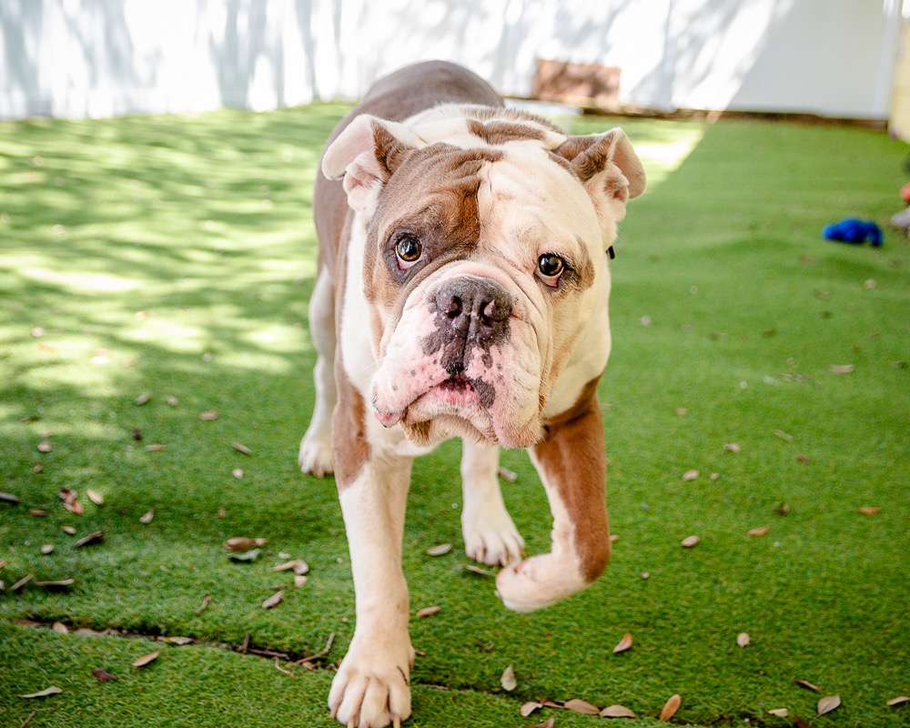 Gunner has his sights set on YOU! He would like you to be his new best friend, ball thrower, treat dispenser and constant companion. This awesome boy is ready to retire to a life of leisure, and he needs you to help make it the best it can be. That smoosh-able face and beautiful brown eye are irresistible, but please research this breed to understand their many needs. Gunner is an 8 year old, 81 pound Olde English Bulldogge. Due to his breed and size, he must go to an owned home with no small children.