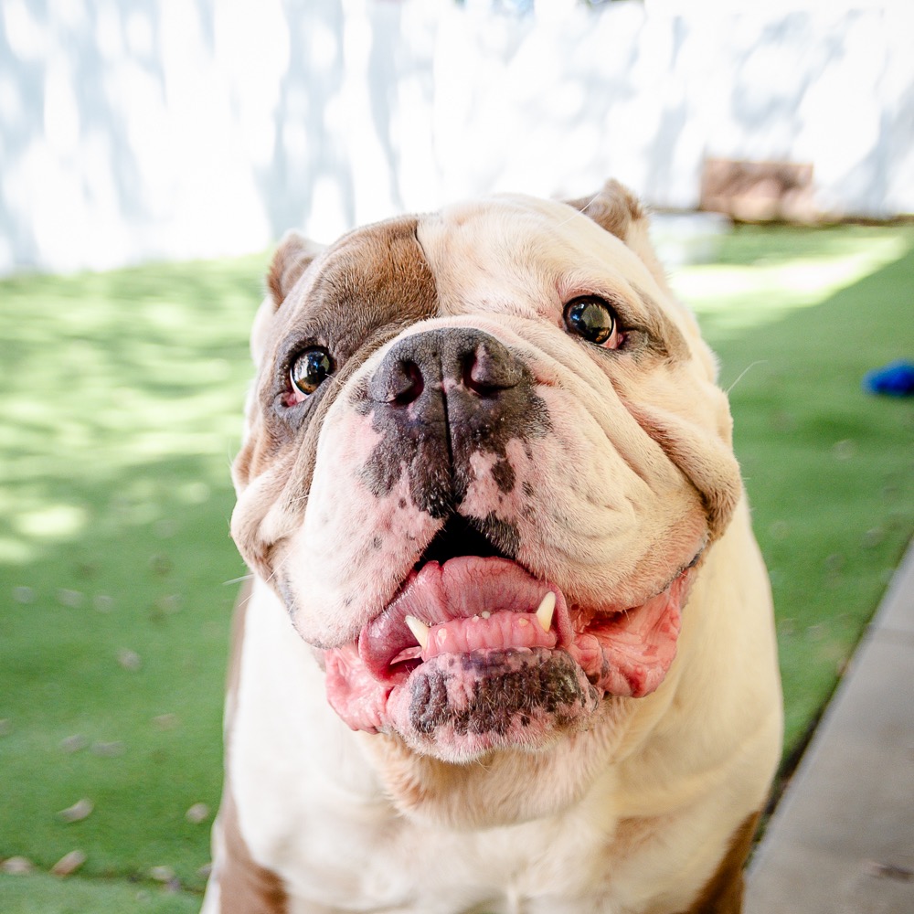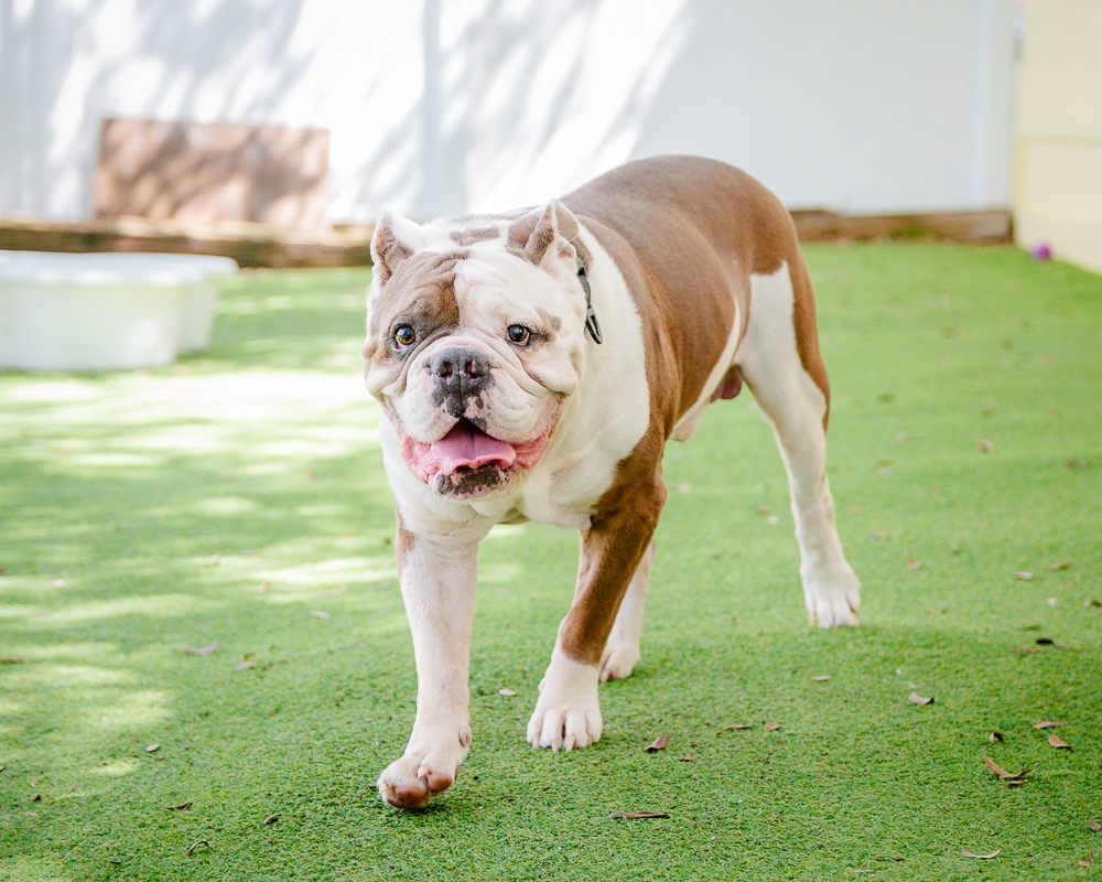 Gunner has his sights set on YOU! He would like you to be his new best friend, ball thrower, treat dispenser and constant companion. This awesome boy is ready to retire to a life of leisure, and he needs you to help make it the best it can be. That smoosh-able face and beautiful brown eye are irresistible, but please research this breed to understand their many needs. Gunner is an 8 year old, 81 pound Olde English Bulldogge. Due to his breed and size, he must go to an owned home with no small children.